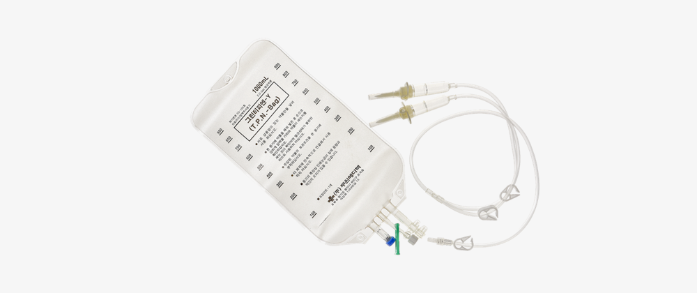 환자에게 수여할 혼합약액을 담고 있는 플라스틱 용기.